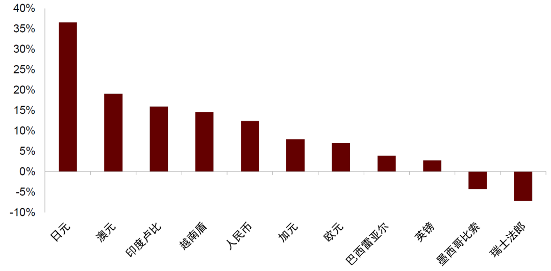 为什么人民币兑美元汇率与其名义有效汇率从2022年开始大幅偏离?名义有效汇率是对主要贸易伙伴的汇率加权平均值,因此人民币名义有效汇率贬值幅度小于对美元的贬值幅度,说明人民币对美元贬值少于中国非美贸易伙伴的货币对美元贬值幅度(图表5)。从2021年1月到2025年4月,人民币对美元贬值12%,而日元、澳元、印度卢比、越南盾分别对美元贬值37%、19%、16%、15%。2021年1月至2025年4月,欧元对美元贬值7%,主要是2025年美国加征关税引发全球资金流向欧洲,带来欧元升值。如果看2021年1月至2024年12月,欧元对美元贬值了17%,同期人民币对美元只贬值13%。由于拜登政府推行的供应链近岸、友岸政策,墨西哥的制造业在2020年后发展较快,所以2021-2024年墨西哥比索对美元升值了4%,特别是在2022-2023年期间升值了17%。2021年以来,瑞士法郎因其避险属性,在俄乌冲突,以及特朗普加征全球关税后,对美元累计升值7%。