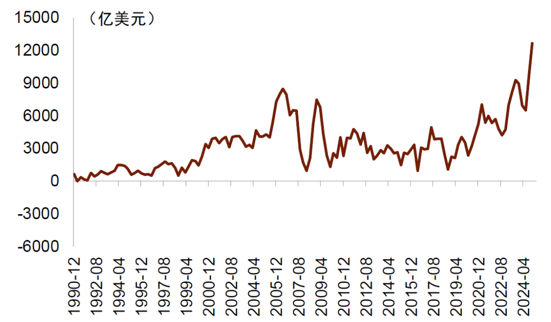我们认为,美元下半年可能还有贬值压力。根据历史上双赤字对美元指数的领先关系,我们预计2025年2-4季度美元指数点位都可能低于彭博一致预期。根据美国国会官方的联合税务委员会(JCT)则预计,特朗普政府的“大美丽法案”将在未来 10 年增加赤字 3.7 万亿美元[1]。短期来看,该法案在解决美债问题后,债务发行量可能在7-9月间达到1.25万亿美元左右,有可能加剧美国金融市场流动性风险,加速外资流出和美元的贬值。中期来看,由于在时间安排上减税政策靠前而减支政策靠后,2026-2028 财年赤字增幅或将较大,我们预计这三年赤字率可能分别达到 6.9%、6.9%和 7.2%。2020年后,美国减少贫富差距、再工业化、增加地缘竞争实力,都要求财政加力。美国财政加力的后果是美债供给增加,美债利率上行。地缘政治因素使得其他国家对美债需求减少,进一步推升美债利率。这种情况下,我们认为如果下半年美联储重启QE,美元指数将进一步弱于预期。