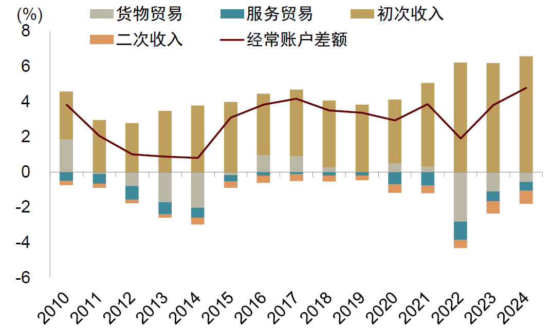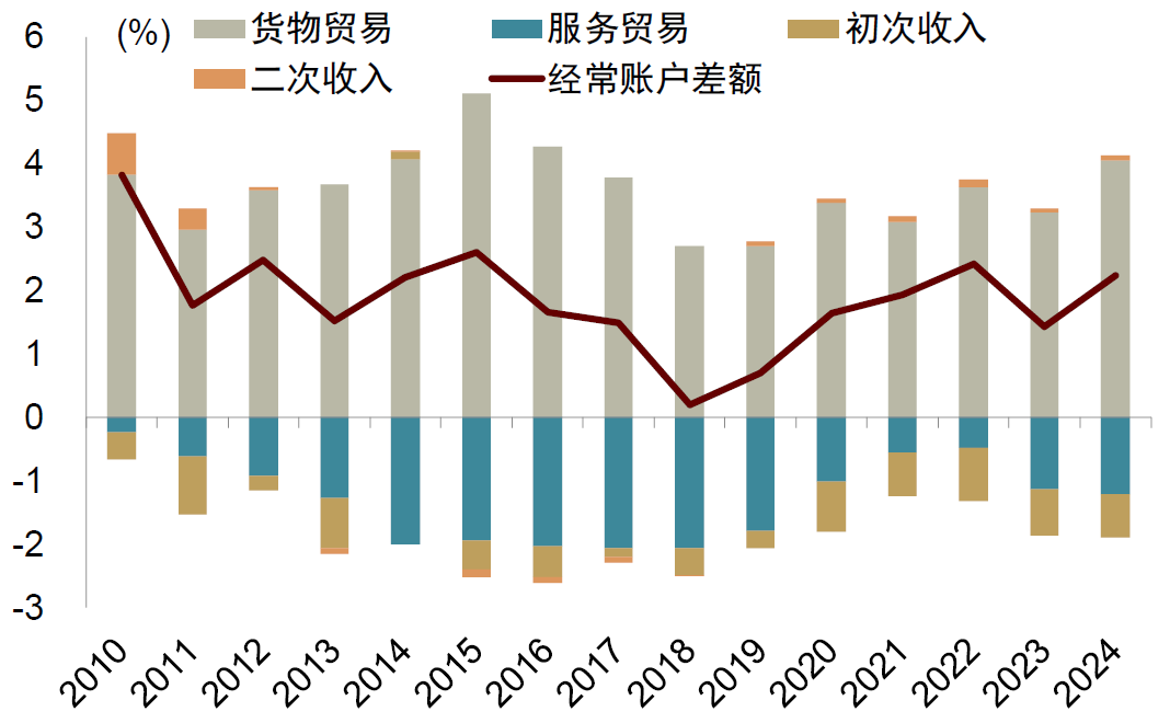 从2019年到2024年,我国出口占全球出口的名义份额从13.1%提升到14.6%。如果考虑实际出口,份额提升更多(图表6)。2024年,我国经常账户的顺差占GDP比例为2.2%,实际上2020年以来整体保持稳定(图表7)。2020-2024年,我国货物贸易顺差占GDP比例保持在3%以上。同期,有些贸易伙伴经常账户顺差收窄。例如,2022年欧元区经常账户顺差转为经常账户逆差,特别是货物贸易顺差大幅下降(图表8)。日本虽然国际收支中初次收入上升,但货物贸易由顺差转为逆差,其经常账户顺差在2022年也减小(图表9)。