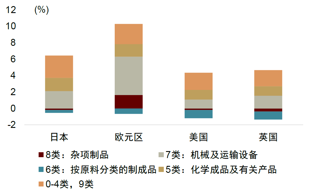 我们不妨用中国与发达经济体的出口相似性指数来衡量中国制造业的竞争力。如果中国的出口结构和发达经济体相似性提升,说明中国的制造业竞争力改善。根据美联储的研究,从2010-2023年,中国与欧元区、日本、英国等发达经济体的出口相似性指数不断上升(图表2)。其中,与欧元区的出口相似性指数上升比较多。分产品看,机械运输设备的出口相似性指数上升较多,主要反映了中国机械和汽车行业的进步。此外,中国与欧元区化学成品及有关产品出口相似性指数也上升较多。