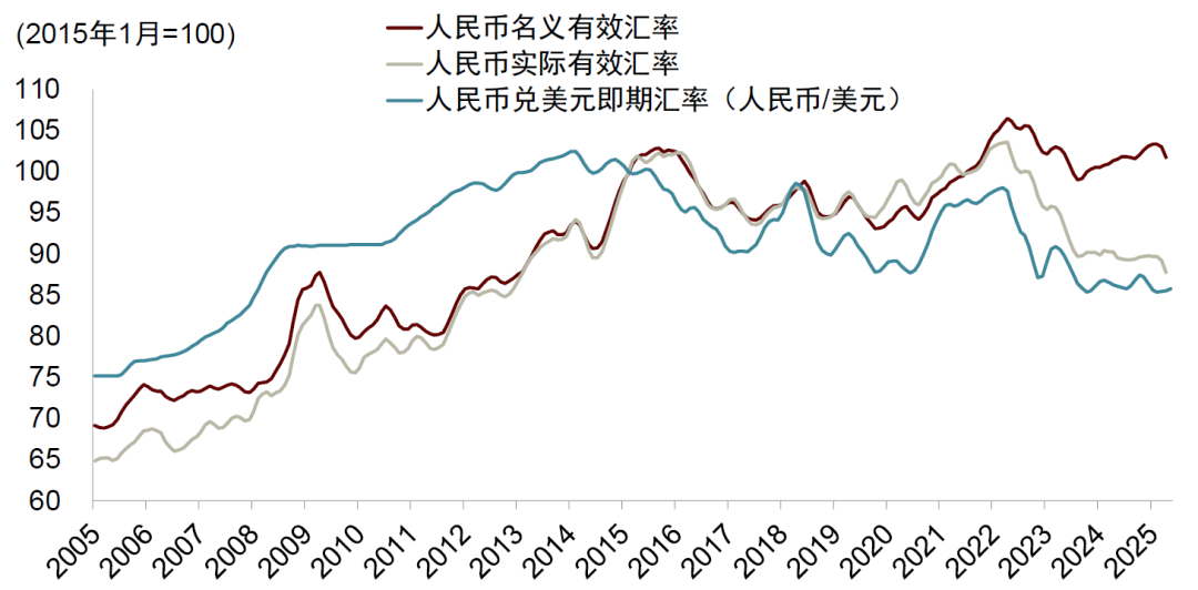 人民币名义有效汇率与实际有效汇率的背离几乎为历史新高,二者之差反映中国与贸易伙伴之间的通胀差距大幅走阔。过去几年,中国的通胀水平偏低,而主要贸易伙伴的通胀水平偏高,从而导致人民币的实际有效汇率走弱(图表4)。2022年以来,中国的通胀水平下行,2023-2024年的CPI同比增速平均为0.2%,2025年前4个月平均为-0.1%。与之对比,美国2023-2024年的同比增速平均为3.6%,2025年前4个月平均为2.6%;其他主要贸易伙伴(包括欧盟、日本、韩国、越南、巴西)在2023-2024年的CPI同比增速平均为3.7%,2025年前4个月平均为3.4%。