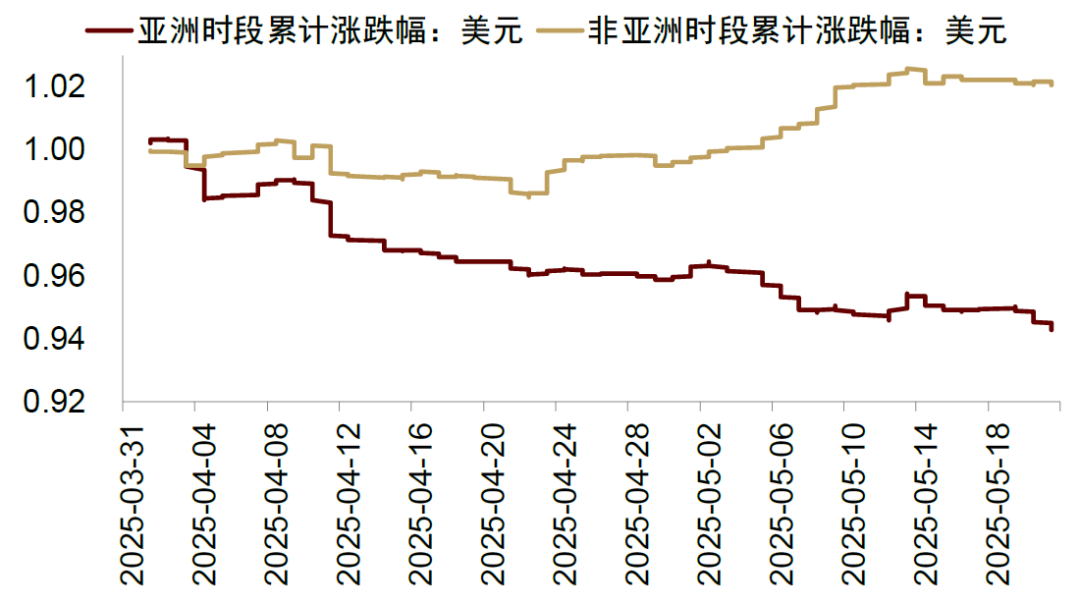 但从资金流向来看,过去两年在AI叙事增强的背景下,海外资金加大对美国的风险投资,推升美元(图表12)。2025年以来,随着Deepseek的出现,美国AI信仰开始出现裂痕。同时,特朗普关税政策增加地缘政治风险,带来不确定性,扰动全球信心。这些因素可能刺激外国资金流出美国,使得美元走弱。2025年4月以来,随着特朗普对等关税公布,美国市场连续4次出现股债汇“三杀”,外资流出动机上升(图表13),其中美元指数走弱基本出现在亚洲时段,也反映了外国资金流出美国(图表14)。