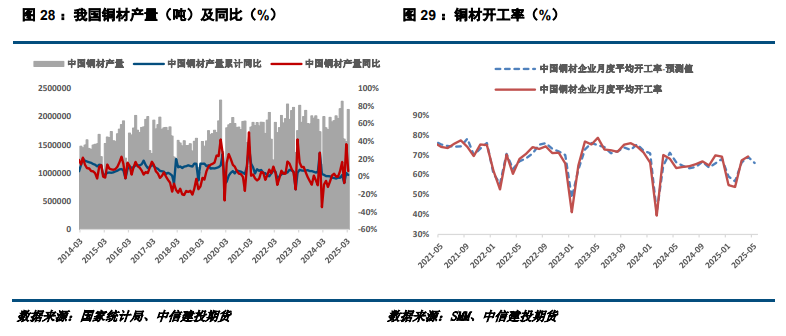 得益于国补政策的提振,4月份铜板带企业开工率约73.8%,环比增长6.75%,同比增长近4%。产量方面,4月份SMM铜板带产量为16.62万吨,环比增长6%,同比增长10.7%,企业原料与成品库存具备累库趋势。展望后市,5-6月中美经贸会谈后带来抢出口期,预计有望加速新能车、消费电子、各类家电等生产与出口,预计5月铜板带产量增速仍有环比提升空间。