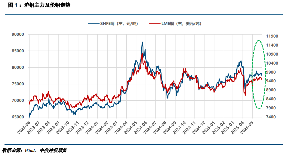 5月铜价在强基本面与弱宏观预期的抗衡下维持窄幅震荡。向下看,矿冶矛盾演绎、非洲矿停产叠加国内再生供应咬紧,强化供需紧缺结构。需求端,中美经贸的会谈带来了抢出口窗口,改善终端淡季疲弱的现状,全球偏低的安全库存为铜价提供了牢固的支撑。向上看,来自于全球关税、美国政府债务持续性的担忧施压铜价。