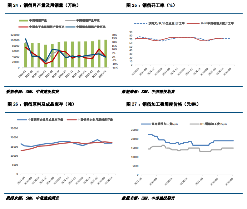 4月份铜箔企业开工率约71.5%,环比微降、同比微增。产量方面,4月份SMM中国铜箔产量为10.2万吨,同比增长13.8%,环比微降。其中,电子电路铜箔、锂电铜箔产量分别为3.7万吨、6.5万吨。加工费方面,因铜价、环氧树脂价格走强,电子电路铜箔加工费小幅上行,锂电铜箔加工费则因终端新能源市场增速放缓而延续承压。