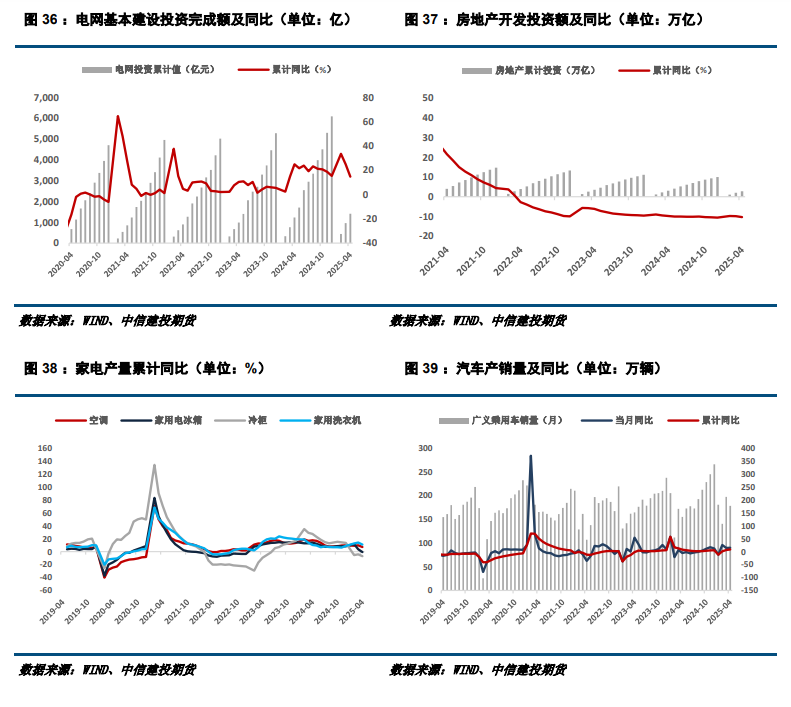 4月终端消费逐步降温。电网方面,1-4月电网投资额累计同比增长约14.6%,虽然增速略收窄,但结合上文4月线缆实际用铜量的增长,预计国内电力建设铜实际消费量增速有望继续提升。地产方面,投资数据表明地产建设依然是铜消费拖累部分,1-4月地产投资降幅进一步萎缩至-10.3%。家电方面,1-4月空调、家用电冰箱、冷柜、洗衣机产量累计同比增速全面下滑至7.2%、-0.7%、-7%、10.9%,符合终端淡季表现。汽车方面,1-4月广义乘用车销量累计同比增长14.8%,增速较1-3月小幅扩张。展望后市,中美经贸第一阶段会谈的良好信号提供抢出口窗口,但终端行业深入淡季,预计抢运对淡季消费改善有限。