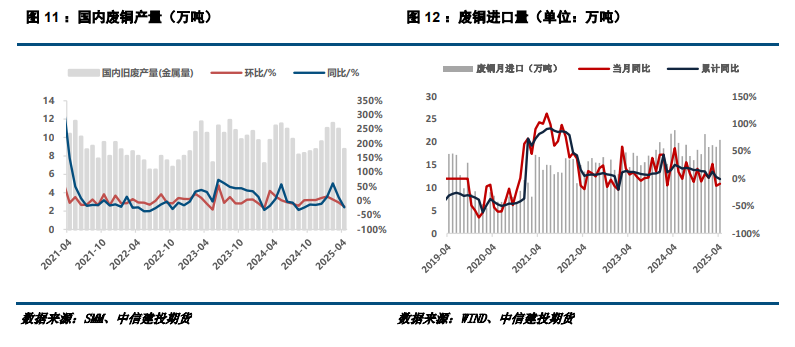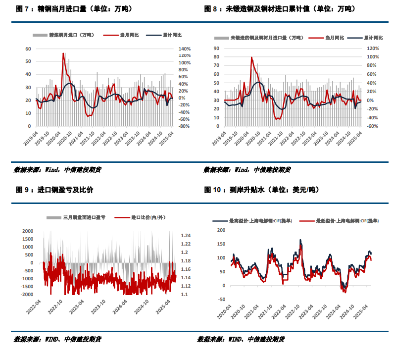 4月沪伦铜比反弹受限,精铜进口预计有限。2025年1-4月中国铜矿进口1003万吨,同比增长25.6%。1-4月精铜进口125.67万吨,同比微降0.8%,4月精铜进口增速偏低主要与COMEX铜抢运需求有关。5月铜232调查担忧持续,海外抢货需求下5-6月进口铜增量或仍有限。