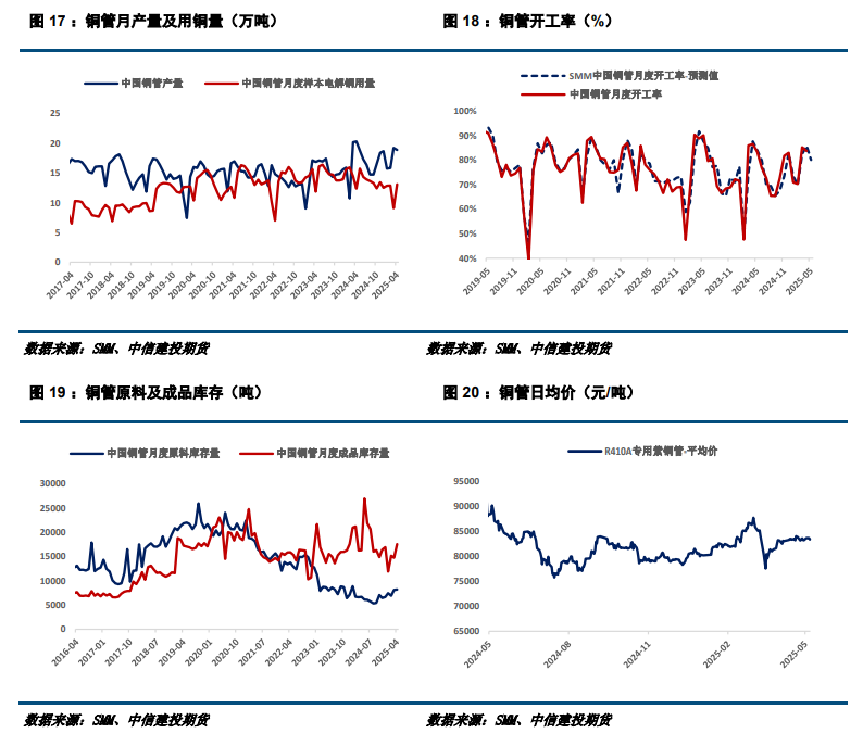 随着国内销售旺季、出口淡季的推进,4月铜管企业开工率小幅下滑至83.7%,同比减少3%。产量方面,4月SMM铜管产量18.86万吨,同比减少7%,环比减少1.77%。据产业在线,4月空调产量同比增长1.9%,销量同比增长2%,其中内销贡献了3.7%的增长,而外销萎缩至-0.2%。据产业在线最新发布,6月家空排产增速下调为11.5%(上一次预测为14.1%),7-8月排产同比增长预期分别为6.3%、2.7%。