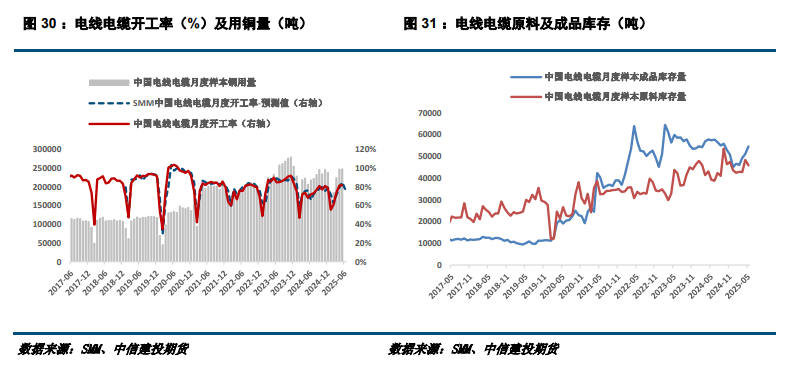 4月份SMM中国线缆企业开工率为81.4%,电线电缆用铜量约24.7万吨,同比扩张近20%,环比微增,进一步验证今年电网建设用铜量实际增长的变化。预计5-6月线缆用铜量在去年的低基数下仍有增长空间,企业开工率则面临一定回落压力。