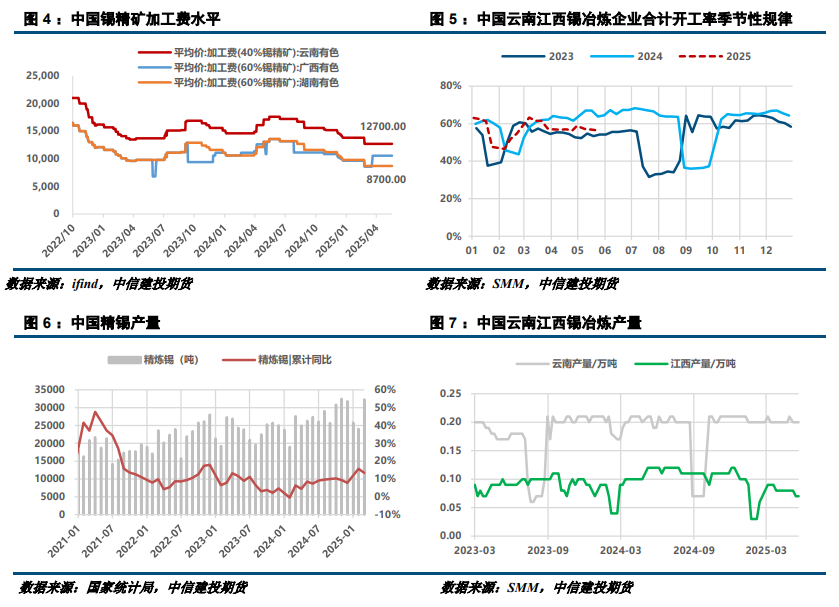 原料供给预期逐步改善,但预计6月锡精矿的增量可能在1.5~1.8千吨,因此仍将维持供给略偏紧的格局。自2023年8月佤邦禁采后,中国锡精矿进口量大幅萎缩,非洲矿与澳矿的补充远难抵消缅矿带来的缺口。同时,2024年1月印尼RKAB审批延迟,锡锭几乎无出口,2025年3月刚果金比齐矿停产,进一步加剧了供应紧张局面。