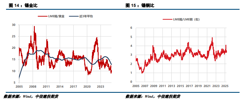 黄金的第三轮牛市令当前锡金比低达9.6,远低于过去3年移动平均的12.8,接近过去20年来的历史低位。美元信用格局受疑下,黄金的避险属性不断强化,分析认为锡金比尚未筑底,预计将进一步向8.5区间运行。这也表明,宏观氛围偏弱对于锡价一定压力。