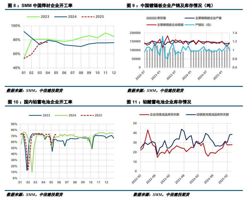 铅酸蓄电池方面,从企业开工率来看,5月最新开工率约73%,高于2023-2024年同期水平,但目前企业从成品库存高累,表明实际消费潜力尚未与排产齐平,推测或与电动两轮车行业抢出口有关,对应经销商成品库存天数,亦能进一步验证。