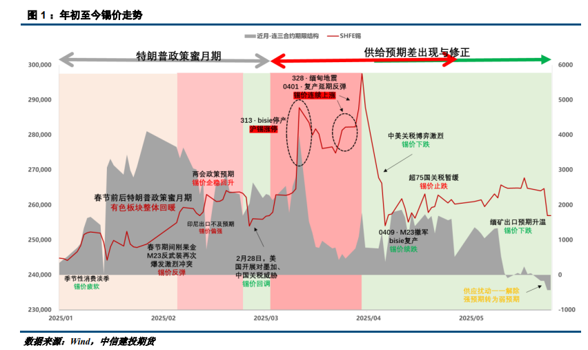 从交易逻辑来看,5月全球锡供应最紧张的预期差已修复,此后2个月将步入供需缺口改善的验证期(尤其是缅矿、非洲矿恢复的出口量情况)。短时间来看,行情或在进口供给、冶炼企业开工情况、库存变化等验证下或有中枢回落压力。长期来看,供应增速落后于需求韧性,今年诸多的供应扰动早已打开上方空间,估值视角下沪锡仍有不错的多配理由。