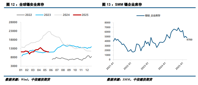 目前全球锡安全库存偏低,至5月23日全球锡显性库存11110吨,较年初几乎持平,但较2024年同期几乎腰斩。其中LME库存的萎缩尤为剧烈——自1月以来暴跌43.7%,绝对量仅余2680吨,逼近2023年6月低位。而隐形库存方面,尽管春节后SMM统计的锡锭企业库存持续去化,但绝对量仍高达4700吨,意味着全球可追踪锡库存总量约1.38万吨。若结合终端消费表现测算,当前库销比与2024年5月基本持平。基于6月供需模型推演,分析认为库存下行空间已极其有限,在无额外供需风险扰动背景下,预计6月全球显性库存大概率维持在1万吨上沿区间,难现进一步去化。