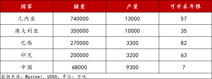 可开采年限:可开采年限的计算方式=已勘察的储量/年产量,所以这是一个动态指标。上文提到,2024年,我国铝土矿储量并不算多,仅占全球的2%,但我国的产量却占全球产量的1/5,因此我国铝土矿可开采年限约为7年。对比其他产量排在世界前列的国家,2024年,几内亚储量为74亿吨,产量为1.3亿吨,那么可开采年限高达57年;澳大利亚储量为35亿吨,产量为1亿吨,可开采年限为35年,也远远高于我国;印尼和巴西因目前产量不大,可开采年限更是分别达到63年和82年。