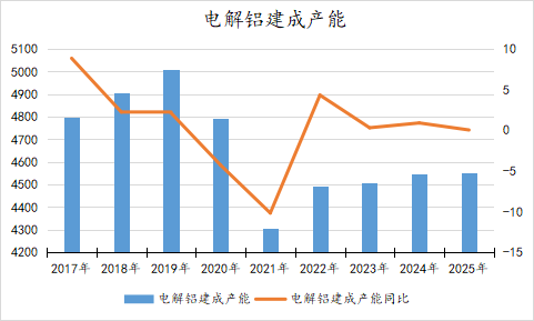 电解铝产能变化:据Mysteel,我国电解铝产能在2017年-2019年处于扩张态势,2019年产能高达5010万吨。我国2016年供给侧改革之后,设定电解铝产能上限为4500万吨,在2020年后严控新增产能,新建项目必须通过关闭旧产能进行等量或减量置换。因此,2020-2021年淘汰山东、新疆等地违规产能,产能向云南、广西等水电富集区转移,2021年电解铝产能下降至4308万吨。随后2022年-2025年,电解铝产能缓慢增长至4550万吨左右。