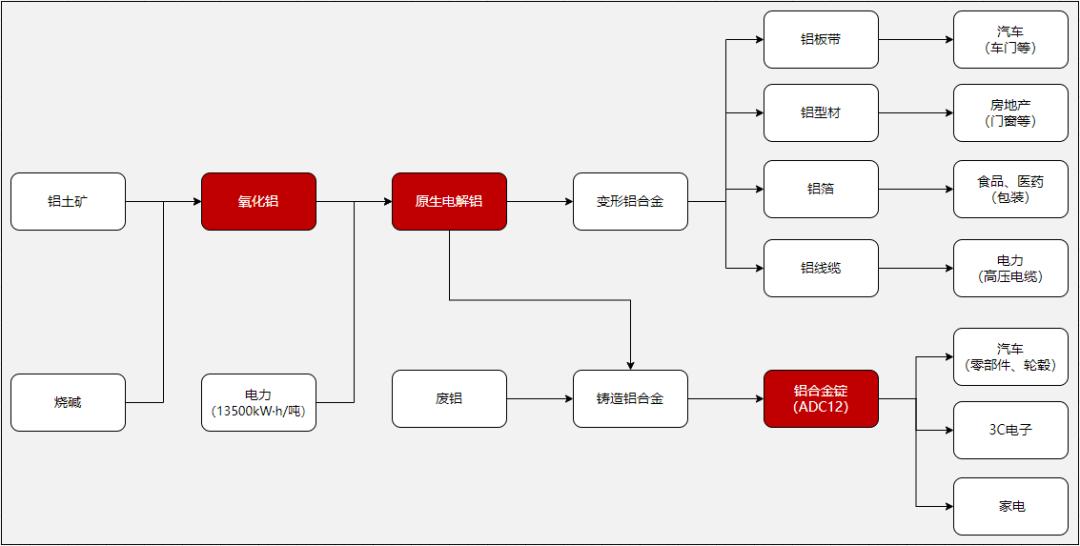 铝产业链,简单来说,就是铝土矿-氧化铝-电解铝-铝合金-终端的传导路径。初始原料为铝土矿,形态正如其名,跟普通泥土区别不大,多数颜色偏红。(1)铝土矿经过一系列处理后加上烧碱可生产出氧化铝(拜耳法),生产一吨氧化铝需要用到约2.5吨铝土矿。(2)氧化铝通过高温熔化,加入少量冰晶石,采用融盐电解法得到电解铝,生产一吨电解铝需要约1.925吨氧化铝,另外需要消耗大量电力,平均生产一吨电解铝的电力需求是13500kW·h。(3)电解铝的下游铝合金可分为变形铝合金和铸造铝合金两种,变形铝合金牌号可分为1-8XXX系,主要的形态为型材、板带、箔等,应用于房地产、汽车、食品包装等领域,而铸造铝合金根据原料类型分为原生和再生,原生铝合金代表牌号为A356,再生铝合金代表牌号为ADC12,主要应用于汽车、3C电子、家电等。