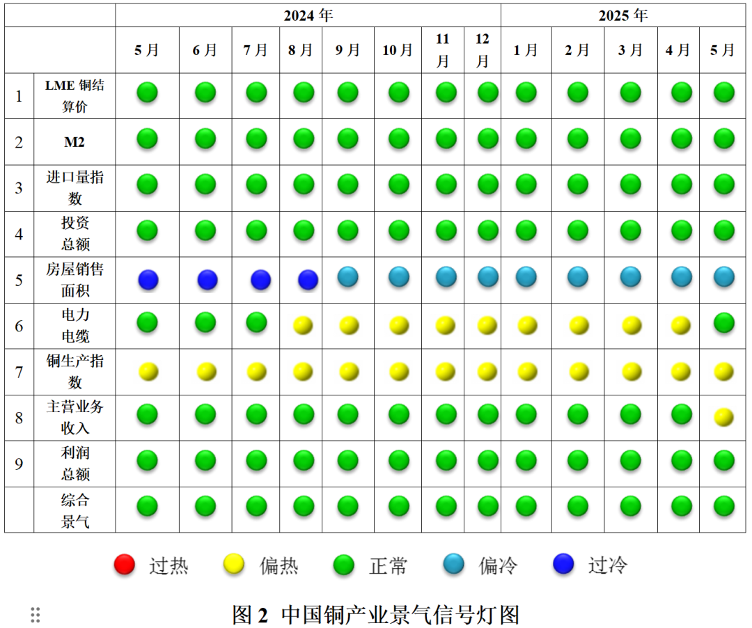 由图2中国铜产业景气信号灯可见,2025年5月份,在构成中国铜产业月度景气指数的所有9项指标中,共6项指标位于“正常”区间,铜生产指数和主营业务收入指标位于“偏热”区间,房屋销售面积指标处于“偏冷”区间。