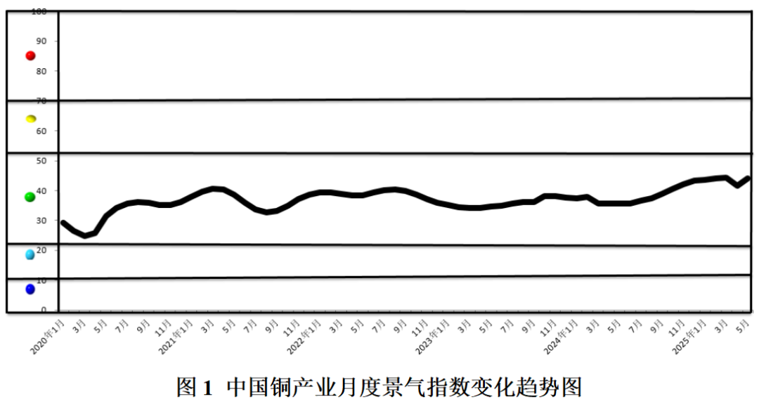 2025年5月份,中国铜产业月度景气指数为44.1,较4月上升2.6个点,继续保持在“正常”区间运行。中国铜产业月度景气指数变化趋势如图1所示。