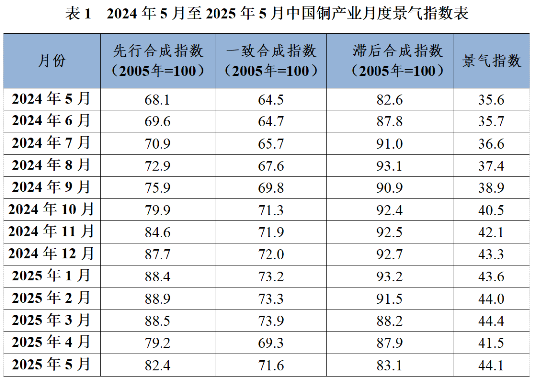 中国铜产业月度景气指数监测模型结果显示,2025年5月份,中国铜产业月度景气指数为44.1,较4月上升2.6个点,继续保持在“正常”区间运行;先行指数为82.4,较4月上升3.2个点;一致指数为71.6,较4月上升2.3个点。最近13个月中国铜产业月度景气指数见表1。