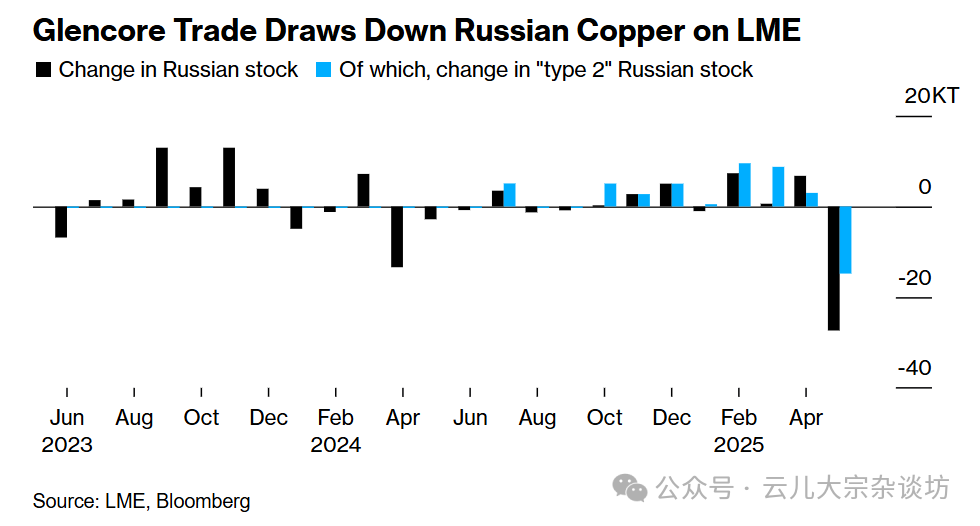 从图中可以看出,自2023年6月以来,LME上俄罗斯铜库存变化起伏不大。然而2025年5月黑色柱状骤降至-27,350吨,蓝色部分亦显示“第二类”库存大幅下滑,这标志着市场对俄罗斯铜的接受度正在悄然恢复。