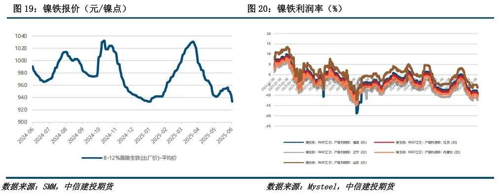 本周镍铁价格下跌。受下游不锈钢需求走弱影响,镍铁价格继续承压,同时成本端镍矿价格仍然偏高,导致铁厂利润继续承压。总的来说,镍铁环节需求弱势不改,利润承压下关注成本支撑,但预计短期反弹空间有限。