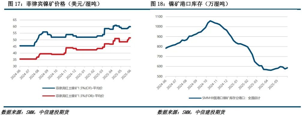 本周镍矿CIF价格上涨。菲律宾方面,矿山发货效率有所提升,但下游需求疲软,矿价压力依然偏高,另外消息面上菲律宾通过矿业财税法案,其中删除原矿出口禁令条款,矿端担忧减弱;印尼方面,印尼镍矿仍然偏紧,使得镍矿升水维持高位。总的来说,印尼镍矿供应偏紧仍在,但菲律宾镍矿需求偏弱,后市矿价或震荡运行。