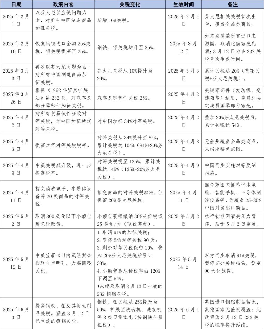 年初以来,美国关税政策频繁调整(见附表1),而市场对美国可能加征铜进口关税的预期也在不断升温,这一预期令两市价差扩大并保持高位水平。3月中下旬在对等关税政策预期下溢价一度超过1600美元/吨,创下历史新高。最近一次美国对华关税政策调整是在6月4日,即提高钢铁、铝及其衍生制品关税至50%,安泰科跟踪CMX和LME价差自6月初以来保持在800美元/吨之上,这意味着市场套利空间与库存转移价差仍偏高,全球铜库存继续呈现流入美国的趋势。