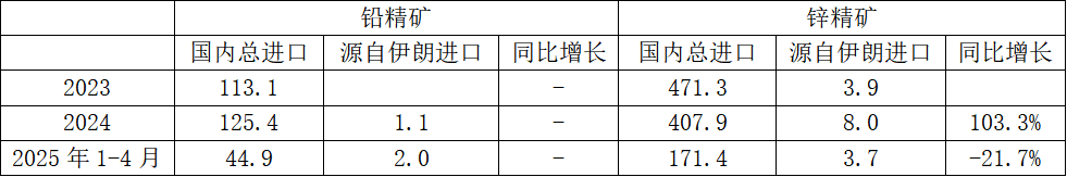 从供应端来看,2024年,源自伊朗进口的铅精矿1.1万吨,占比0.9%;锌精矿8.0万吨,占比2.0%。2025年1-4月,源自伊朗进口铅精矿约为2.0万吨,占总进口量4.5%。自2024年10月开始,铅精矿才开始从伊朗进口,之前暂未有进口。源自伊朗进口锌精矿约为2.9万吨,占总进口量1.7%,同比下降21.7%。