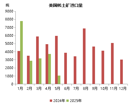一、2025年1-5月美国稀土金属矿进口量大幅减少