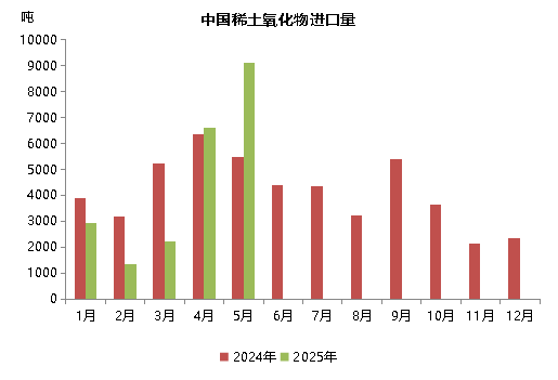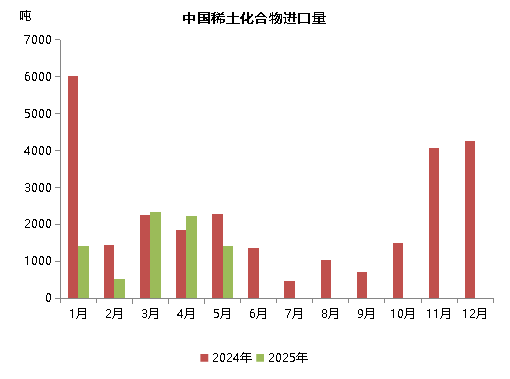 2025年1-5月份,我国累计进口稀土金属及合金约为85吨,同比下降50.4%;同期进口稀土氧化物2.2万吨,同比下降7.9%;同期进口稀土化合物约7934吨,同比下降43%。