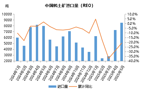 近年来,我国稀土精矿的进口来源主要是美国,占比接近99%。2025年1-5月,中国自美国进口稀土金属矿18737吨,同比减少23.2%,降幅较1-4月增加了19个百分点;进口额5007万美元,同比下降28%。