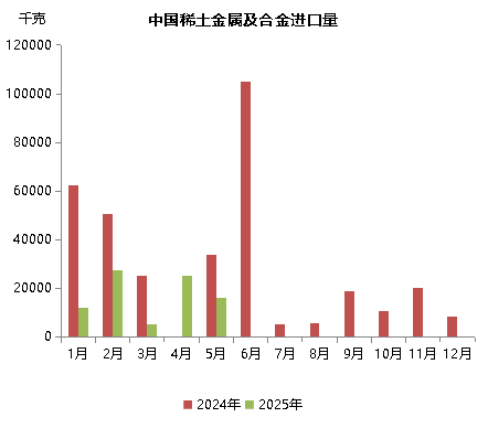 从稀土冶炼分离产品(稀土金属及合金、稀土氧化物、稀土化合物)的进口方面来看,2025年1-5月份,累计进口量3万吨,同比下降20.7%。