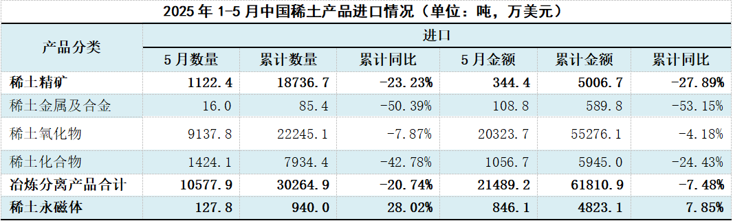 四、2025年1-5月稀土冶炼分离产品进口量同比下降20.7%