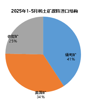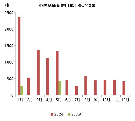 2024年以来,由于缅甸局势动荡,稀土原料进口受到较大影响,根据5月份进口情况看,这一情况进一步缓解。2025年1-5月份,我国从缅甸进口1.2万吨稀土氧化物,同比下降约38%,降幅较1-4月份减少17个百分点;进口量占同期氧化物总进口量的55%,进口品种全部为“未列名氧化稀土”;1-5月,我国从缅甸进口730吨稀土化合物(其中2-4月份未进口),同比萎缩89%,占比降至9.2%,进口品种全部为“其他未列名稀土金属及其混合物的化合物”。据测算,2025年1-5月,我国从缅甸进口的稀土原料中(稀土氧化物和稀土化合物),REO总含量同比下降约41.5%,降幅较1-4月份减少12个百分点。