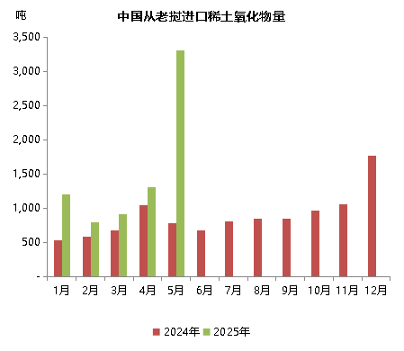 2025年1-5月,我国从老挝进口7512.2吨稀土氧化物,同比增长110%,占同期氧化物总进口量的33.7%,进口品种全部为“未列名氧化稀土”。其中,5月份进口量达到3309吨,创历史新高。同期未从老挝进口稀土化合物。
