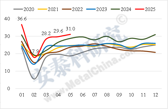 七、铝制品出口环比增长。5月,我国出口铝制品31.0万吨,环比增长4.6%,同比增长8.3%,为历史同期最高水平。美国是我国铝制品出口的最大目的国,去年出口占比16.3%。受芬太尼关税、对等关税等多重影响,当月向美国出口量持续下滑,同比下降34.6%,环比下降3.2%,占总出口量的比重降至9.9%。