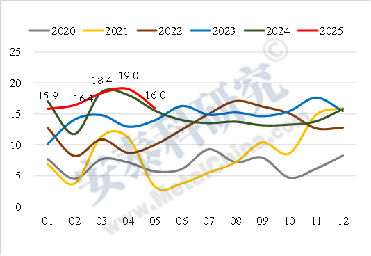 1-5月,我国累计进口铝合金46.5万吨,同比下降11.4%;累计出口9.5万吨,同比下降1.4%。