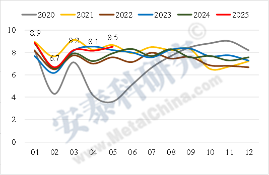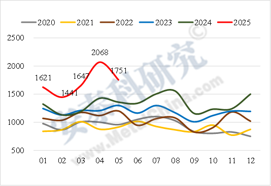 图5 2020-2025年我国废铝月度进口量(万吨)