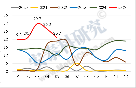 图2 2020-2025年我国氧化铝月度出口量(万吨)