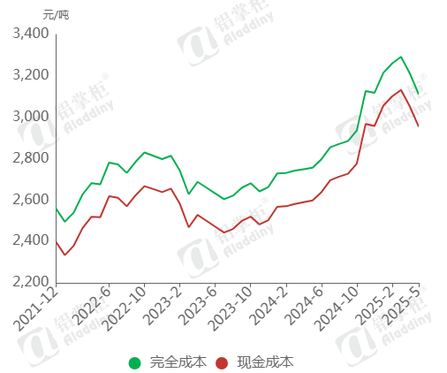 随着几内亚铝土矿在2025年1月份攀升至100美元/吨之上,国内氧化铝生产成本错时不断上升,阿拉丁(ALD)调研统计:2025年全国氧化铝生产成本最高攀升至3292元/吨,较去年同期增长536元/吨。