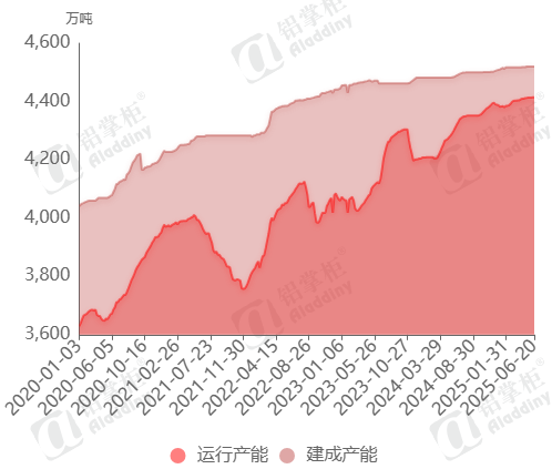阿拉丁(ALD)调研统计:截至2025年6月份,全国电解铝企业目前全国建成产能在4520.2万吨,较去年同期增长36.5万吨,全国运行产能4414.9万吨,较去年同期增114万吨。