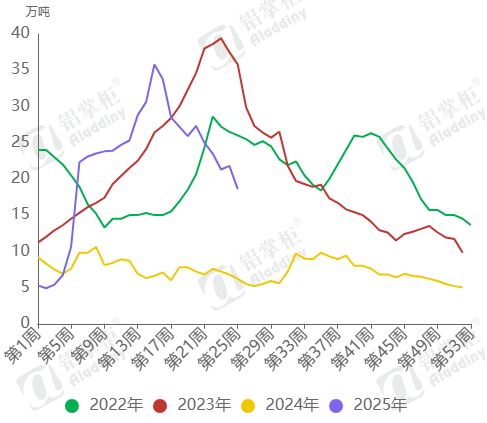 阿拉丁(ALD)调研了解:截至6月19日,全国主流港口氧化铝库存量3.8万吨,低于24年同期9.1万吨,低于23年同期23.1万吨,低于22年同期41.7万吨。