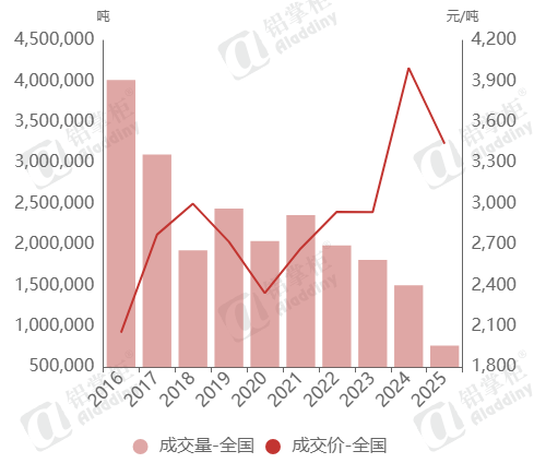 图13:2016-2025年北方氧化铝现货成交量走势图