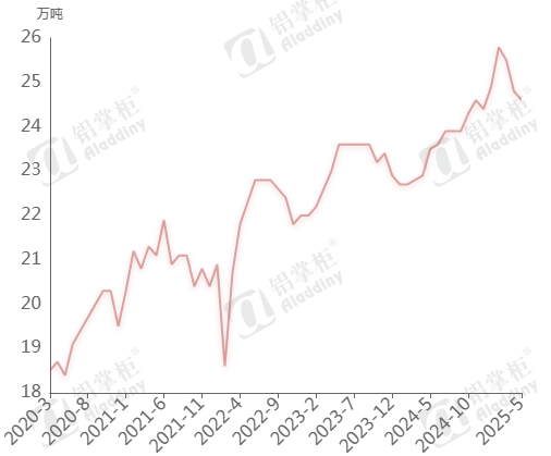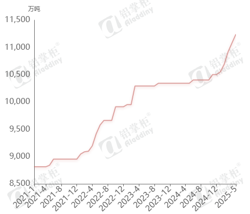 阿拉丁(ALD)调研统计:截至2025年5月份,全国电解铝产量为1831万吨,较去年同期增长58万吨。