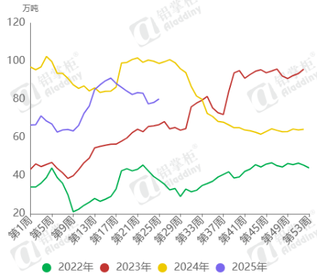 图17:2022-2025年全国堆场/在途/站台/交割库氧化铝库存走势图