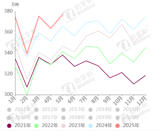 2025年全国氧化铝日产量较以往有所提升,1-5月日均产量在24.9-25.8万吨之间波动,较去年同期22.7-23.5万吨明显提升。随着下半年广西地区新投产能的加入,预计日均产量仍存在一定增加预期。(因6月份还未彻底完结,实产产量暂无数据)