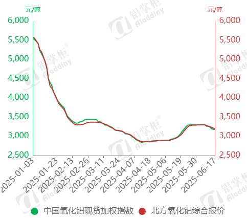 2025年上半年,国内氧化铝价格经历了一场剧烈的“过山车”行情,呈现“深跌后反弹、再遇阻回落”的阶段性特征。北方氧化铝综合报价自1月初以5580元/吨便开启单边下行通道,至4月中旬最低触及2860元/吨,累计跌幅达2720元/吨,跌幅高达48.7%,价格近乎腰斩。4月下旬起,市场在超跌后逐步企稳,进入窄幅震荡整理期;5月则迎来阶段性反弹,价格自低位逐步回升至6月初的3295元/吨,较4月中旬低点反弹435元/吨,涨幅15%,市场情绪有所修复。然而,进入6月中旬后,反弹动能明显衰竭,价格再度承压回落,截至6月23日,北方氧化铝综合报价已回调至3110元/吨,较6月初下跌185元/吨,跌幅5.6%,市场重归弱势震荡格局。
