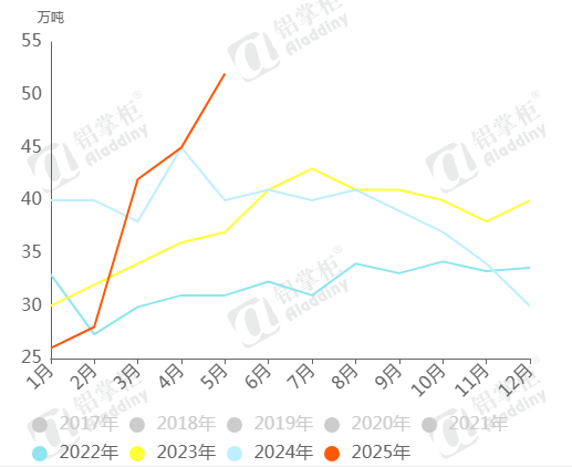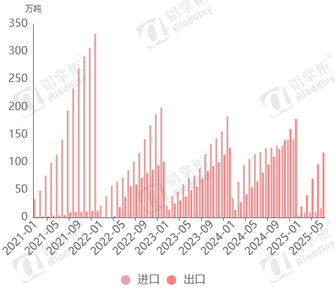 据海关总署公布数据显示,2025年1-5月累计出口氧化铝117.2万吨,同比增79%;1-5月累计进口氧化铝16.7万吨,同比降85%;1-5月累计净出口达到100.53万吨。