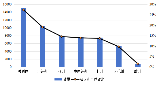 从公布的各大洲2023年黄金资源情况看,独联体国家资源储量约15010吨(较2019年小幅减少390吨),全球占比27.41%,排名第一;北美洲国家资源储量10470吨(较2019年减少1890吨),全球占比19.12%,排名第二;亚洲国家资源储量7980吨,全球占比14.57%,排名第三。
